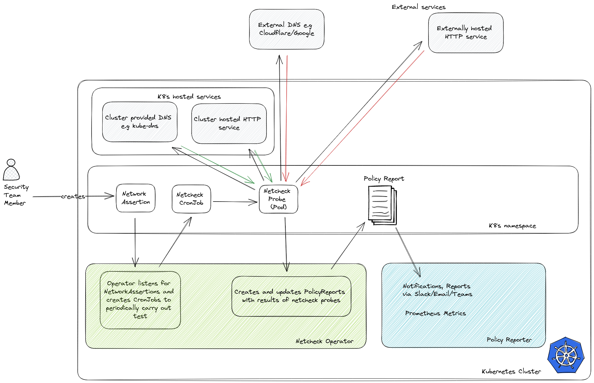 • Listens for NetworkAssertion resources across the kubernetes cluster and creates CronJobs (or Jobs) for each of them.